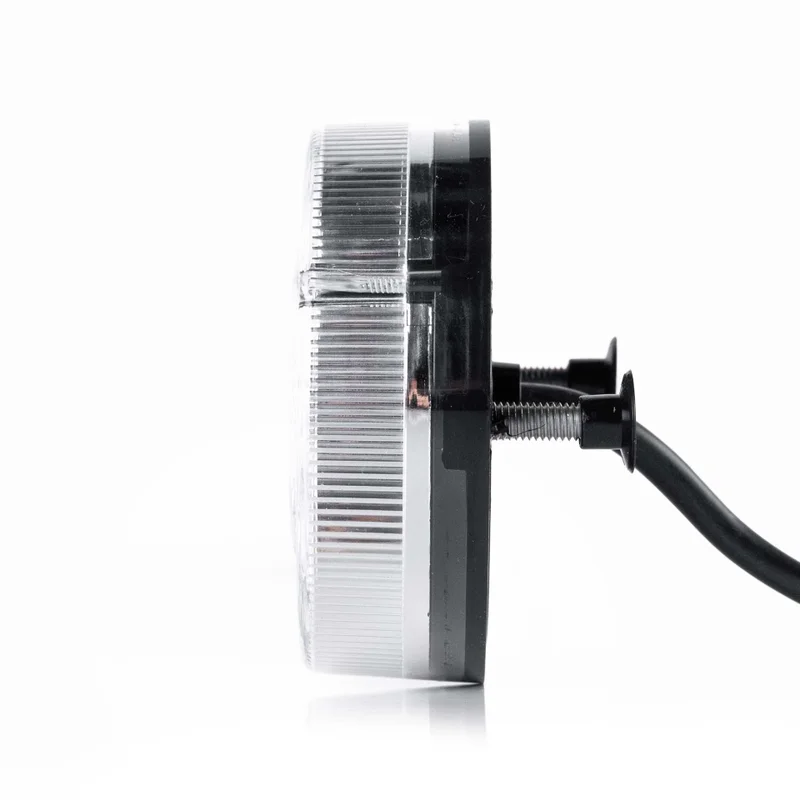 Dit LED achterlicht combineert de functies: achterlicht, remlicht en knipperlicht. Door het ronde formaat van ø90 x 32 mm en de heldere lens integreert het model eenvoudig in uiteenlopende voertuigontwerpen. Het achterlicht voldoet aan CE, ECE R10, ECE R6 en ECE R7 richtlijnen, wat duidt op elektromagnetische compatibiliteit en functionele veiligheid binnen de Europese markten.