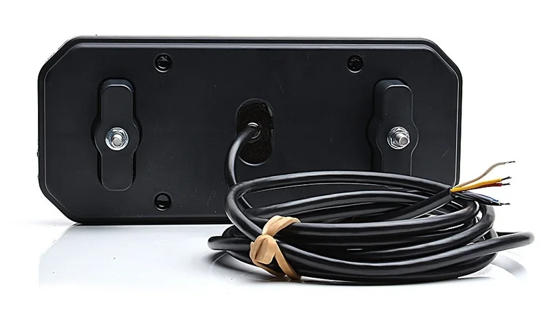 De behuizing is vervaardigd uit ABS en voldoet aan IP68, wat het achterlicht geschikt maakt voor intensieve omstandigheden waarbij bescherming tegen stof en water vereist is. Certificeringen zoals CE, ECE-R10, ECE-R3, ECE-R6, ECE-R7, ECE-R23 en ECE-R38 bevestigen de naleving van Europese richtlijnen voor voertuigverlichting. Aansluiting gebeurt via een open draadeind met een kabellengte van 200 cm, wat flexibiliteit biedt bij installatie.