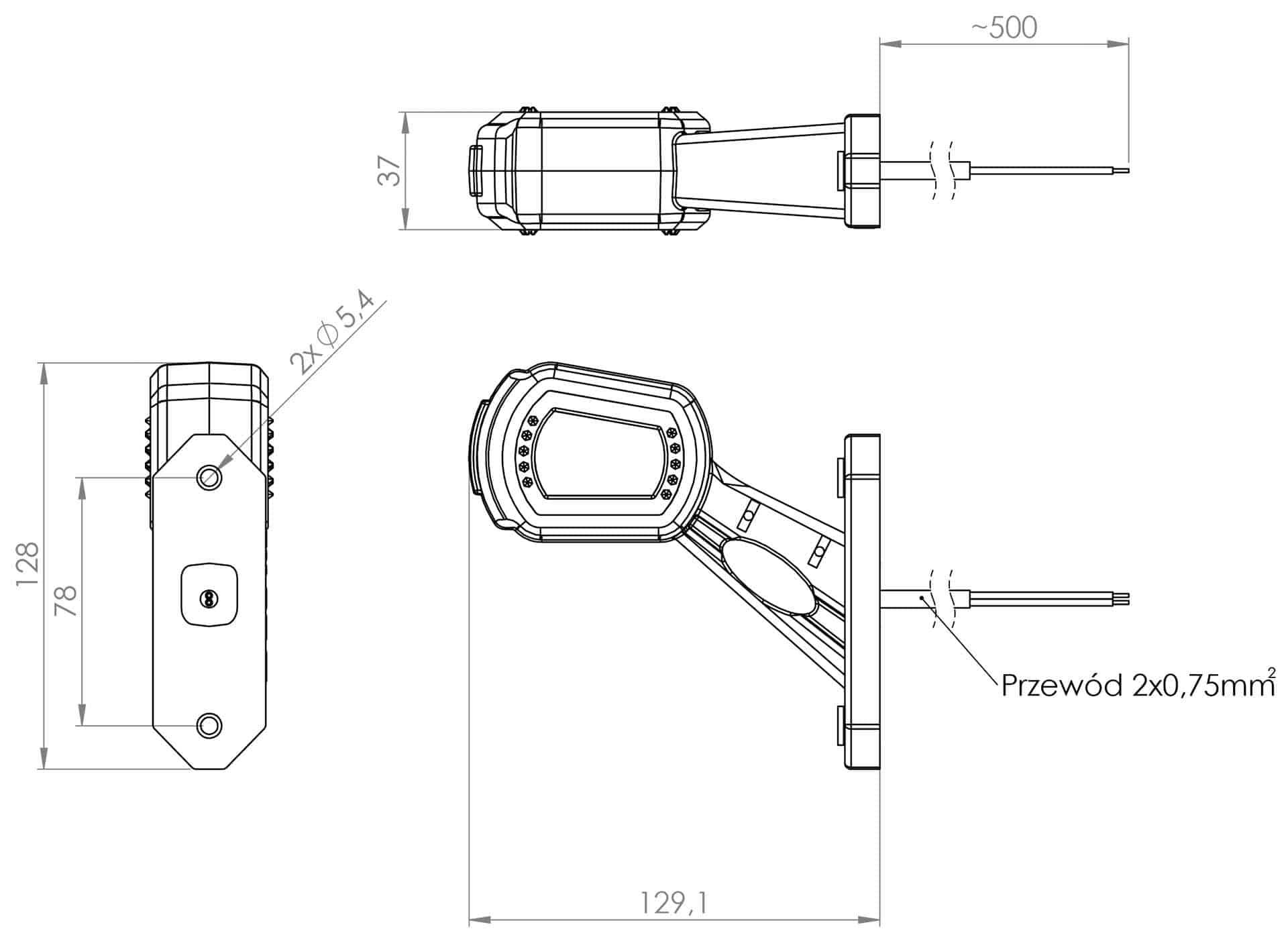 De breedtelamp wordt geleverd met een open draadeind en een 30 cm lange kabel, wat flexibiliteit biedt tijdens de installatie. Met een afmeting van 129x128x37 mm is het slanke ontwerp geschikt voor voertuigen waar ruimte beperkt is. Het product voldoet aan IP68 en is gecertificeerd volgens CE, ECE-R10, ECE-R7 en ECE-R91.