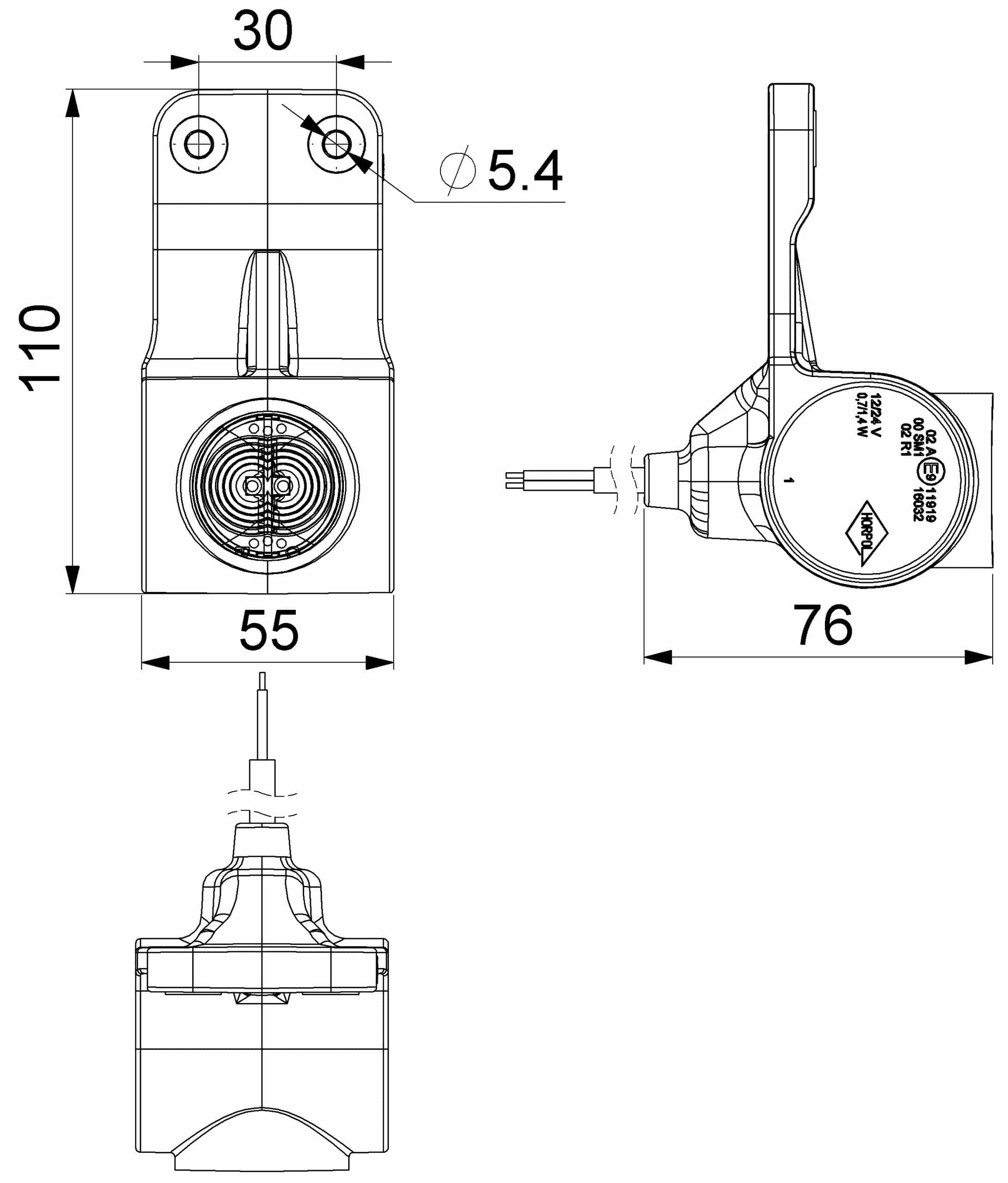 De lamp is voorzien van een rubberen behuizing en een slagvaste polycarbonaat lens, geschikt voor hangende montage. Met beschermingsklasse IP68 is de armatuur volledig stof- en waterdicht. Certificeringen volgens CE, ECE-R10, ECE-R7 en ECE-R91 ondersteunen de technische conformiteit met Europese richtlijnen. De aansluiting verloopt via een open draadeind met een kabellengte van 50 cm. De afmetingen bedragen 55x76x110 mm.