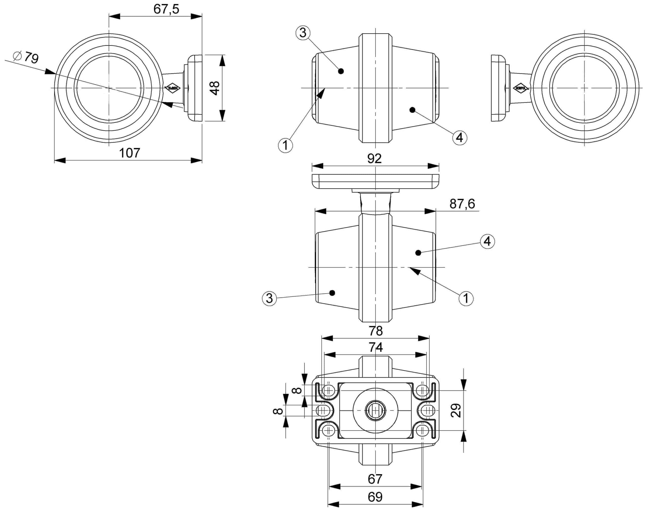 Met een diameter van 79 mm en een totale lengte van 107 mm (behuizing 92 mm dik) is deze opbouwmontage eenvoudig te integreren. De breedtelamp functioneert binnen een spanningsbereik van 12–24 V, en voldoet aan de richtlijnen CE, ECE-R10 en ECE-R6-CAT5. De IP68-classificatie garandeert volledige stof- en waterdichtheid, wat deze breedtelamp geschikt maakt voor langdurig gebruik onder uiteenlopende weersomstandigheden.