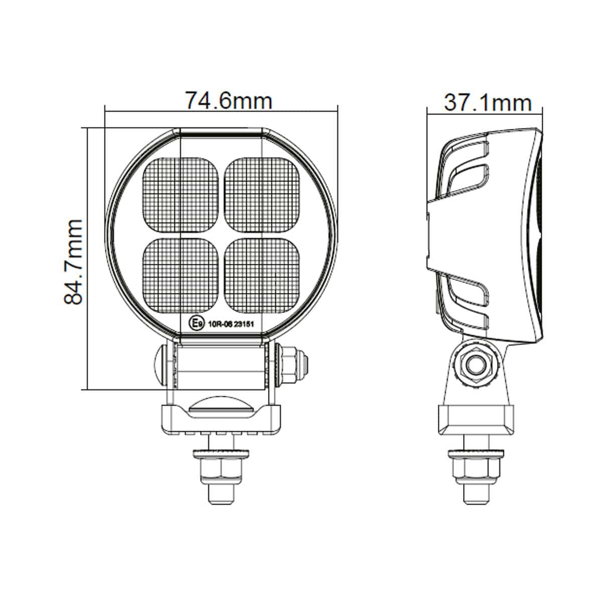 De compacte behuizing van 74,8 x 69,5 x 37,1 mm is vervaardigd uit aluminium en voorzien van een slagvaste polycarbonaat lens. De werklamp is opbouw te monteren met een 50 cm lange kabel en 2-PIN’s Deutsch-connector. Verdere kenmerken zijn de IP69K-bescherming en certificeringen zoals CE, ECE R10 en CISPR25 Class 3, geschikt voor voertuigtoepassingen met hoge eisen aan elektromagnetische compatibiliteit.