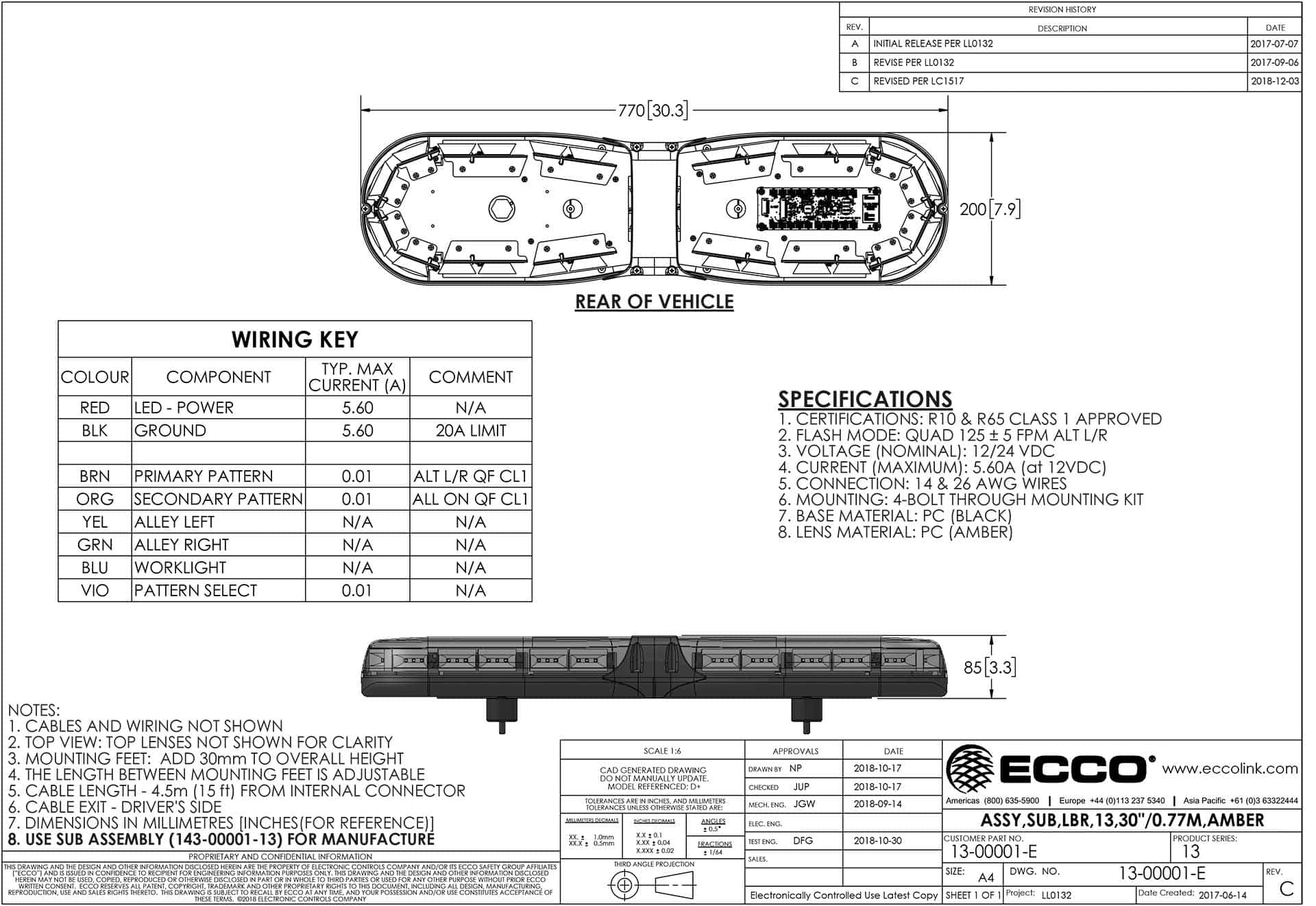 De behuizing is vervaardigd uit aluminium en voorzien van een polycarbonaat lens. De 450 cm lange aansluitkabel met open draadeind vergemakkelijkt de installatie. Deze LED zwaaibalk voldoet aan de certificeringen CE, ECE R10 en ECE R65 Class 1, wat aanduidt dat het product elektromagnetisch compatibel is en geschikt voor gebruik als visueel waarschuwingsmiddel onder verschillende weersomstandigheden.