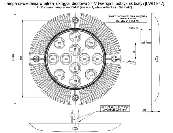 De LED interieurverlichting levert 500 lm bij een kleurtemperatuur van 4500K (neutraal wit), wat zorgt voor heldere en comfortabele verlichting binnenin het voertuig. De lamp is voorzien van een open draadeind met 45 cm kabellengte en kan eenvoudig worden geïnstalleerd via opbouwmontage. Met een beschermingsgraad van IP68 en certificeringen volgens CE en ECE R10 is deze lamp volledig geschikt voor professioneel gebruik in vochtige of stoffige omgevingen.