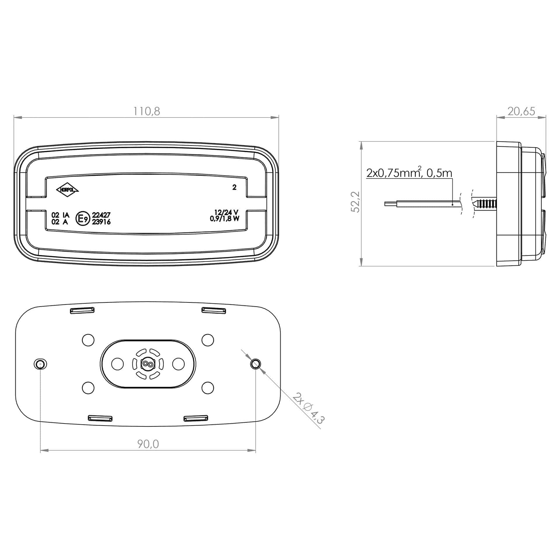 Dit amberkleurige LED markeringslicht uit de MV-4900 serie van Horpol is ontworpen voor toepassing als zij markeerlicht met geïntegreerde reflector. Dankzij het compacte formaat van 111 x 52 x 20,5 mm en de opbouwmontage is het geschikt voor montage op diverse typen bedrijfsvoertuigen. De behuizing en lens zijn vervaardigd uit polycarbonaat, wat het product bestand maakt tegen mechanische belasting en vocht. De verlichting werkt binnen een spanningsbereik van 12–24 V, en is voorzien van een 50 cm lange aansluitkabel met open draadeinde. De IP68-classificatie garandeert stof- en waterdichtheid bij onderdompeling. Verder is deze LED markeringslicht voorzien van CE-markering en goedgekeurd volgens de normen ECE R10, ECE R3 en ECE R91.