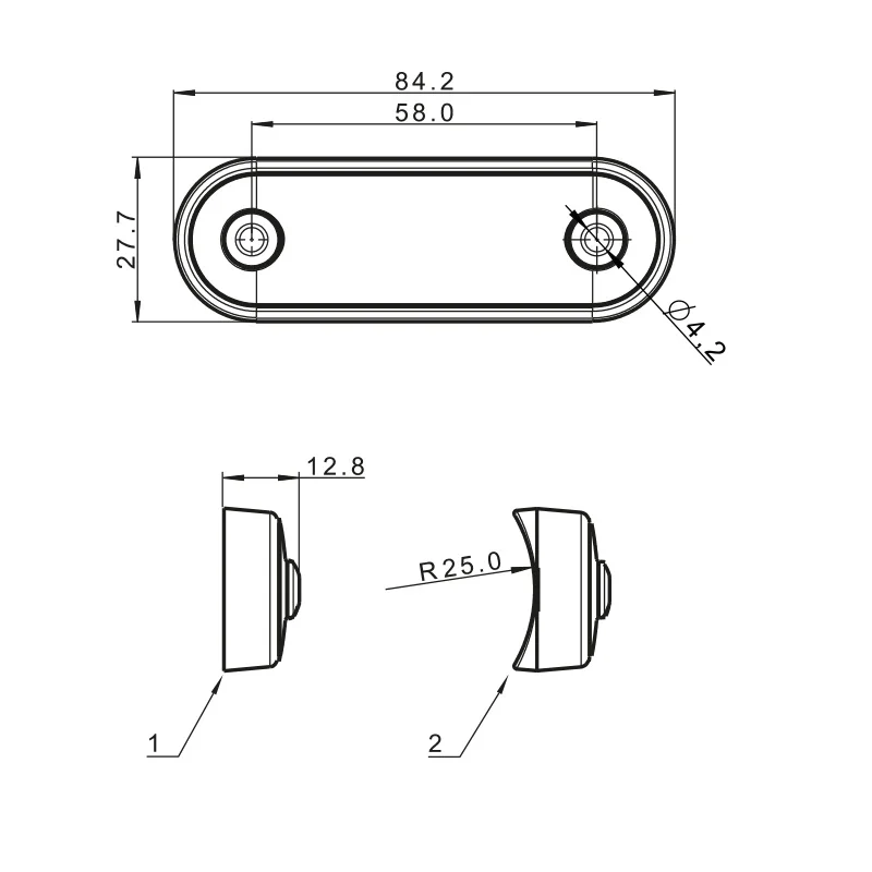 De behuizing is vervaardigd uit polycarbonaat en rubber voor verhoogde schokbestendigheid. De lens is eveneens van slagvast polycarbonaat. Het markeringslicht is gecertificeerd volgens CE, ECE-R10 en ECE-R7 richtlijnen. De aanduiding “WATERPROOF” duidt op beschermd gebruik onder diverse weersomstandigheden.