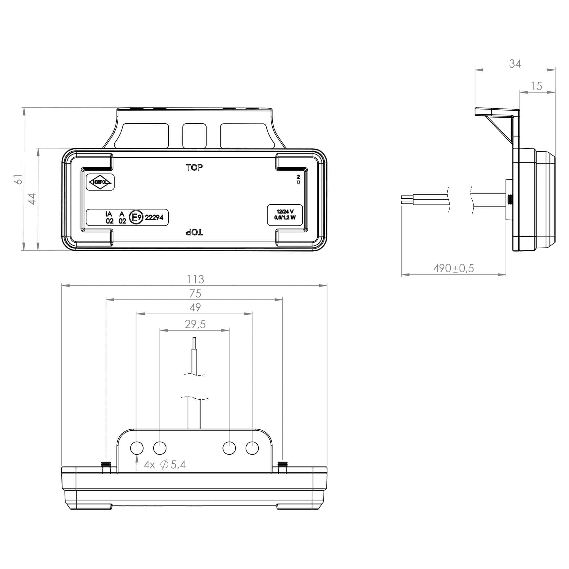 Het markeringslicht is uitgevoerd met een robuuste polycarbonaat behuizing en lens, met een compacte afmeting van 113x61x34 mm. De behuizing is stof- en waterdicht volgens IP68. De aansluiting verloopt via een open draadeind met 50cm kabel. Dit model voldoet aan de CE-, ECE-R10-, ECE-R3- en ECE-R91-certificeringen.