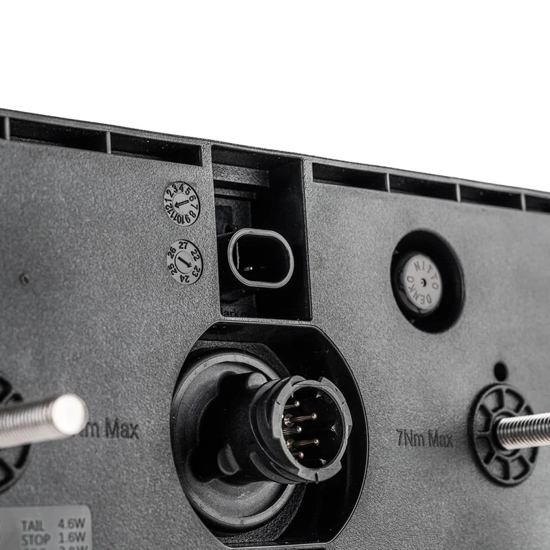 De afmetingen van 253x136x48 mm maken het geschikt voor opbouwmontage achter op het voertuig. De IP69K-classificatie garandeert maximale bescherming tegen stof en water onder hoge druk. De verlichting voldoet aan CE, ECE-R10, ECE-R148 en ECE-R150 richtlijnen. Aansluiting verloopt via een 7-PIN’s AMP connector in combinatie met twee 2-polige Superseal-uitgangen.