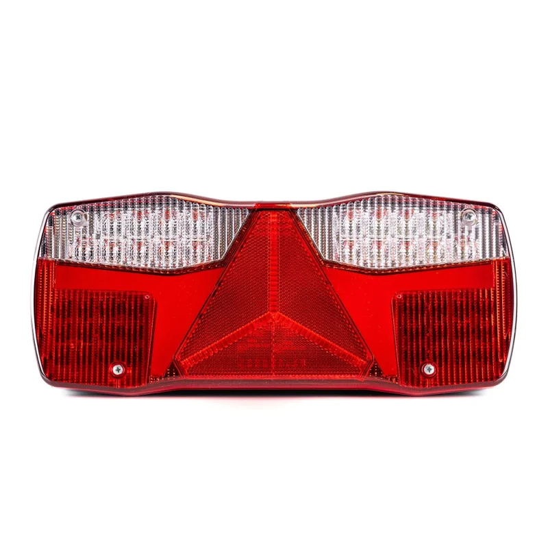 Dit LED achterlicht combineert de functies: achterlicht, remlicht, knipperlicht, dynamisch knipperlicht, mistlicht, achteruitrijlicht en kentekenverlichting. De unit voldoet aan diverse certificeringen, waaronder CE, ECE-R10, ECE-R3, ECE-R4, ECE-R6, ECE-R7, ECE-R23, ECE-R38 en ECE-R91, wat duidt op brede inzetbaarheid binnen Europese regelgeving.