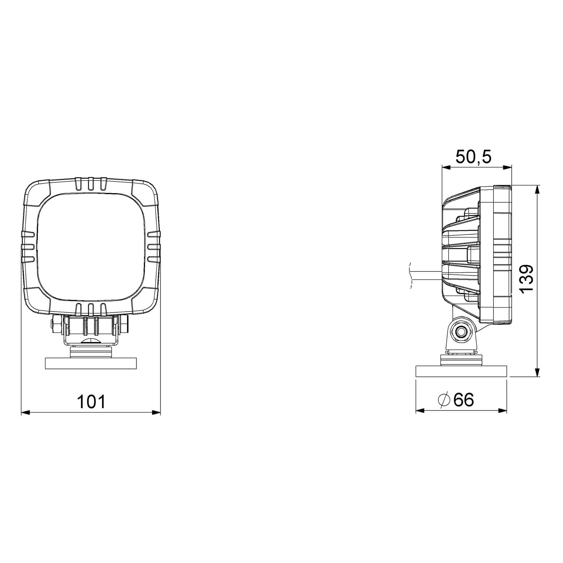 Dankzij de IP68-classificatie is deze LED werklamp volledig stof- en waterdicht, terwijl de ECE-R10 certificering elektromagnetische compatibiliteit waarborgt. De lamp is voorzien van een open draadeind en een kabellengte van 150 cm, geschikt voor opbouwmontage. Met een afmeting van 110 x 110 x 50,5 mm blijft de lamp robuust en tegelijkertijd ruimtebesparend.