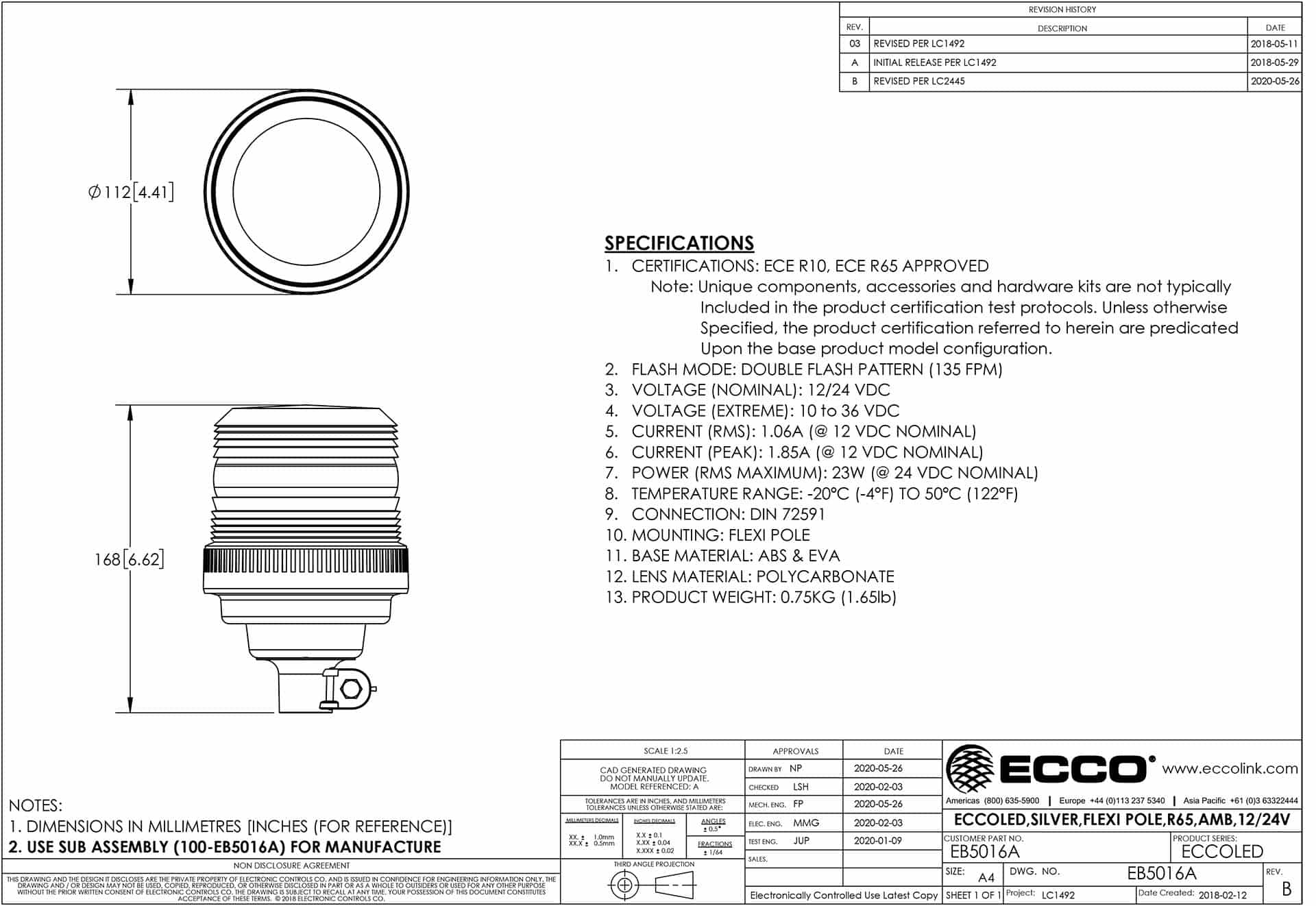 Deze LED zwaailamp werkt binnen een spanningsbereik van 12–24 V en is bestand tegen stof en waterstralen (IP65), wat bijdraagt aan de duurzaamheid in veeleisende omstandigheden. De behuizing en lens zijn volledig vervaardigd uit polycarbonaat, wat extra bescherming biedt tegen mechanische invloeden. Verder beschikt het model over CE-, ECE-R10- en ECE-R65-certificering.