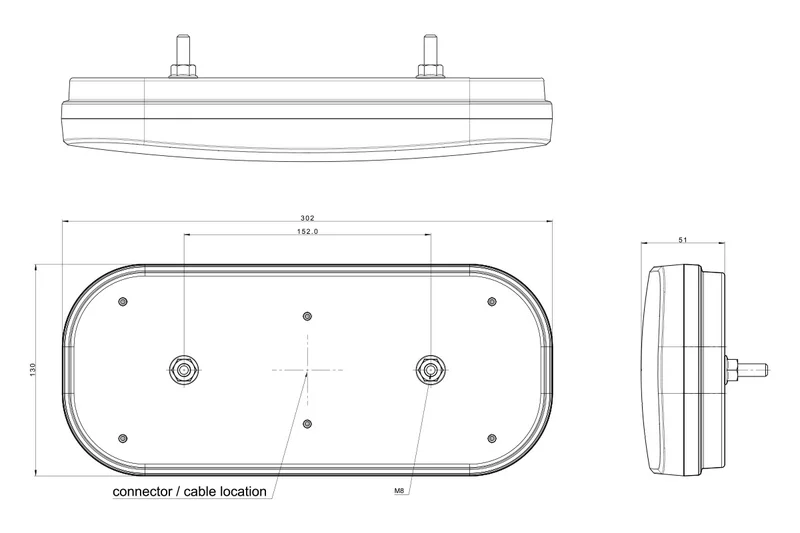 Dit achterlicht combineert de functies: achterlicht, remlicht, knipperlicht, dynamisch knipperlicht, mistlicht en achteruitrijlicht. Daarnaast is het voorzien van een geïntegreerde reflector. De afmetingen bedragen 302x130x51 mm, waardoor het model geschikt is voor diverse configuraties binnen carrosserie-, trailer- en bedrijfsvoertuigbouw. Het product voldoet aan meerdere ECE-regelgevingen (waaronder R10, R6, R23 en R38) en draagt ook het CE-keurmerk.