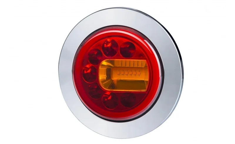 Dit achterlicht combineert de functies: achterlicht, remlicht en knipperlicht. De lens is eveneens uitgevoerd in polycarbonaat en zorgt voor een egale lichtverdeling. Het armatuur voldoet aan IP68 en is gecertificeerd volgens CE, ECE-R10, ECE-R7 en ECE-R6 normen, wat compatibiliteit in professionele omgevingen waarborgt. Optioneel is een chromen ring beschikbaar voor afronding van de inbouwmontage.